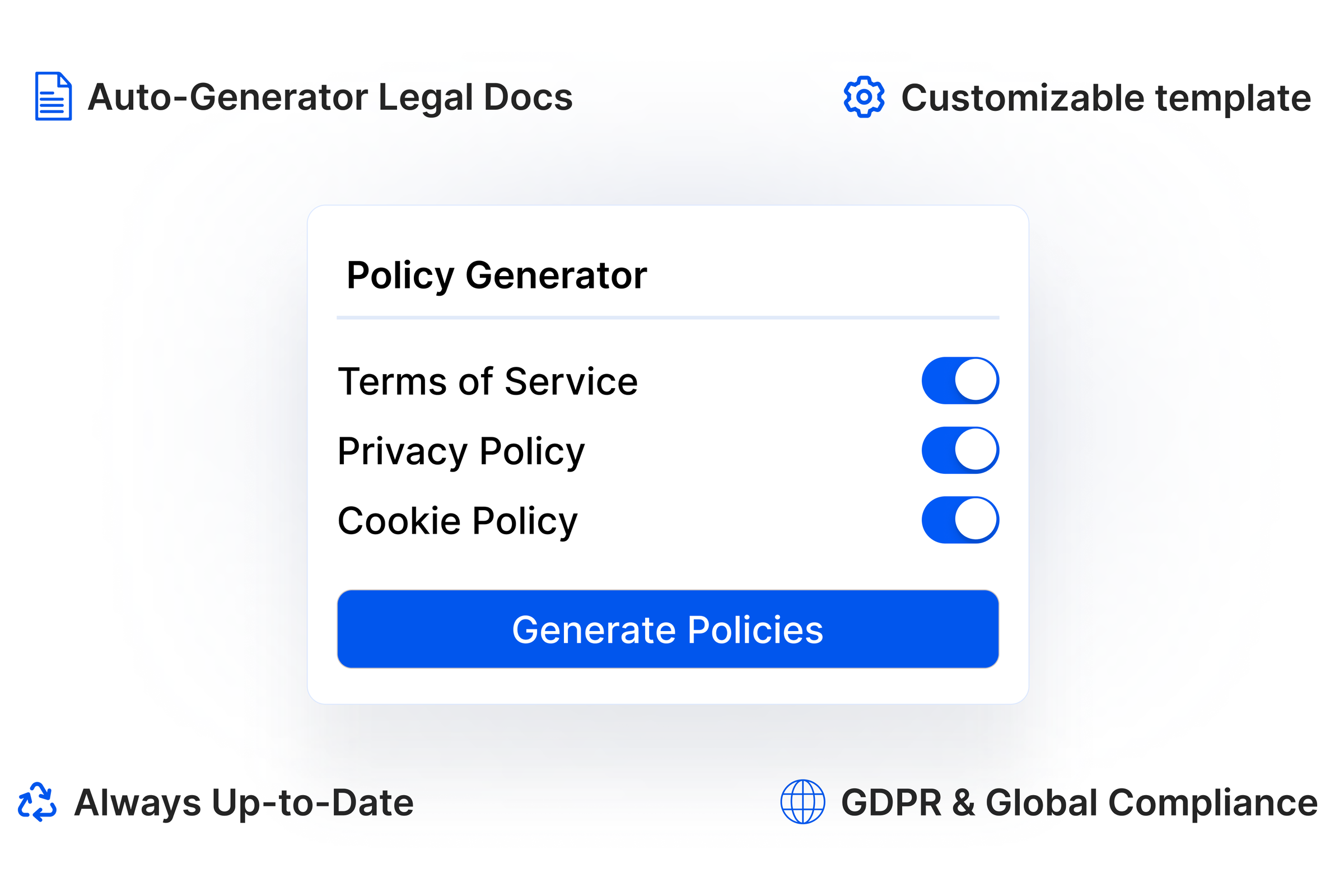 The Policy Generator quickly creates GDPR, CCPA, and other privacy policies tailored to your business needs with just a few clicks, removing the hassle of creating these documents from scratch.