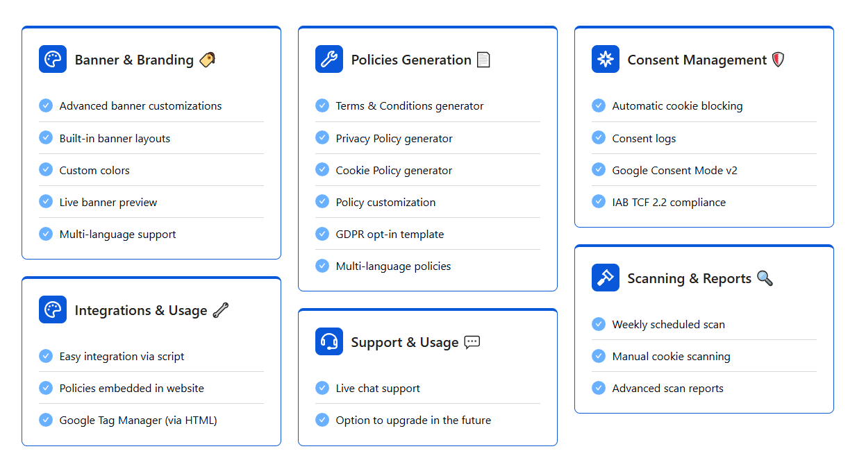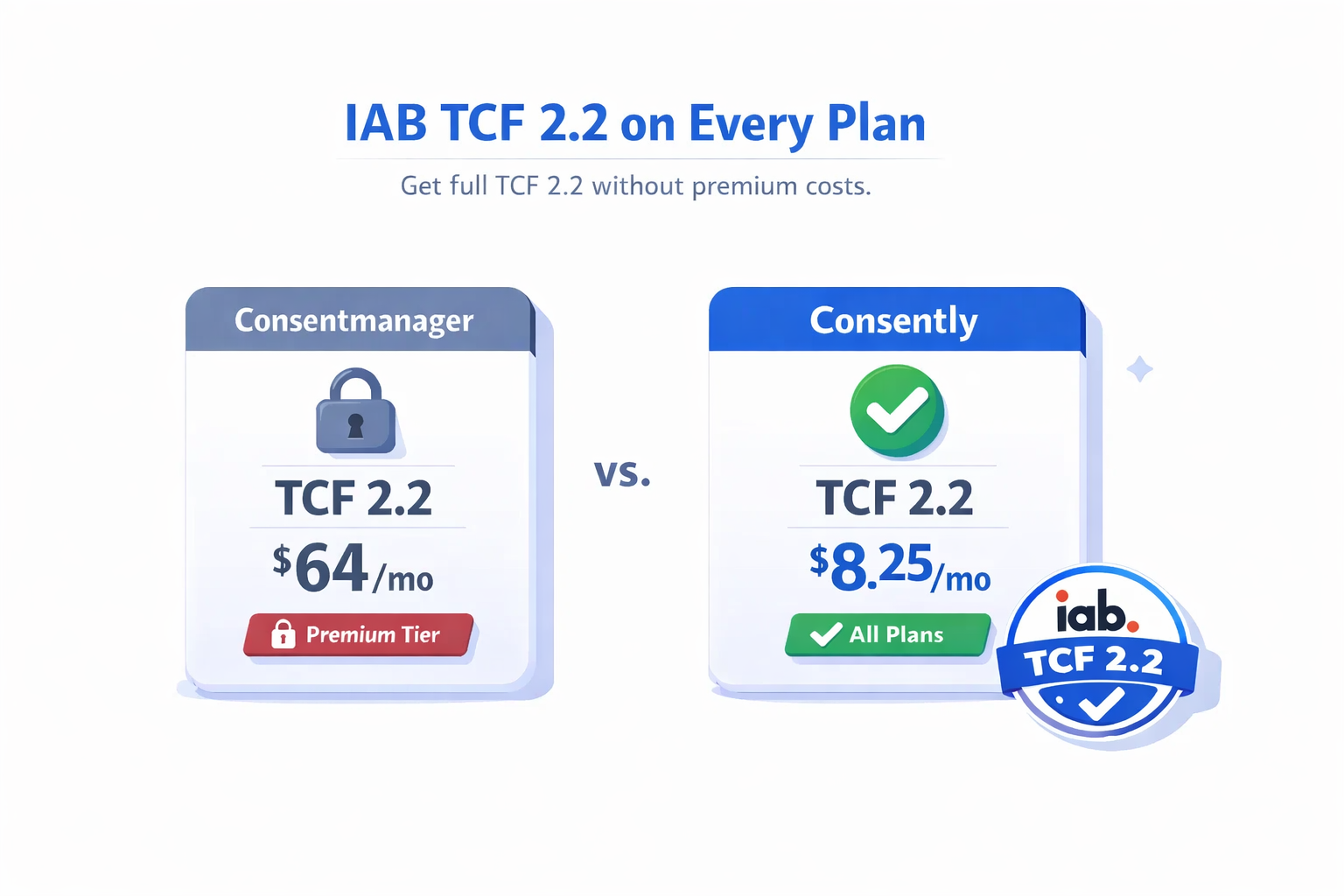 ConsentManager charges $64/month just to unlock IAB TCF 2.2 and A/B testing. Consently includes every feature on all plans starting at $8.25/month. Get cookie scanning, auto-blocking, three policy generators, and certified IAB TCF 2.2 compliance without navigating complex pricing tiers or paying for feature unlocks.