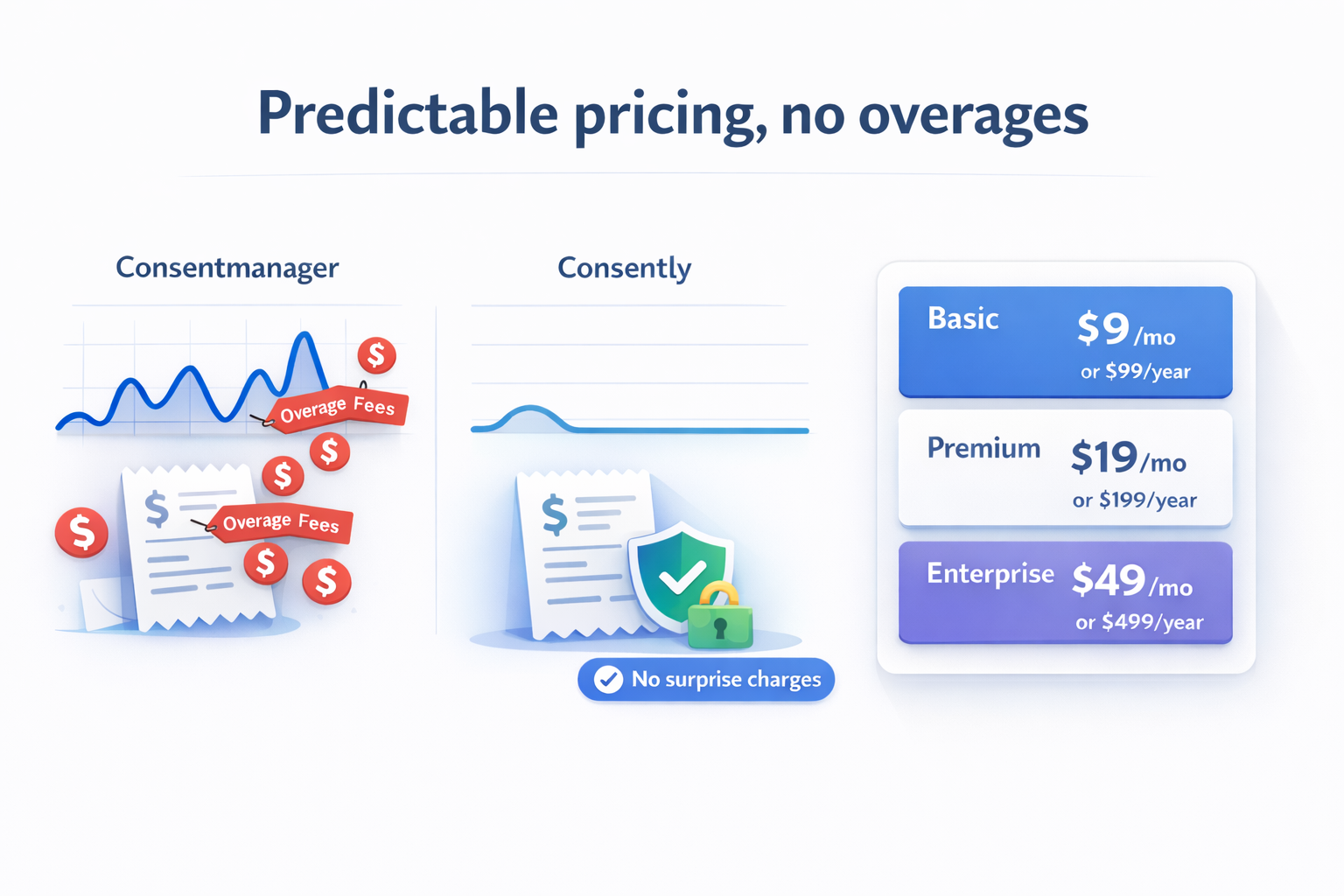 ConsentManager charges per-pageview fees when you exceed plan limits—$0.02 to $0.5 per 1,000 extra views, depending on tier. Consently offers clear pricing: Basic ($9/month or $99/year), Premium ($19/month or $199/year), and Enterprise ($49/month or $499/year). Where Consentmanager billing fluctuates with traffic spikes, Consently caps pageviews at tier limits without surprise charges. Budget your compliance costs with certainty.