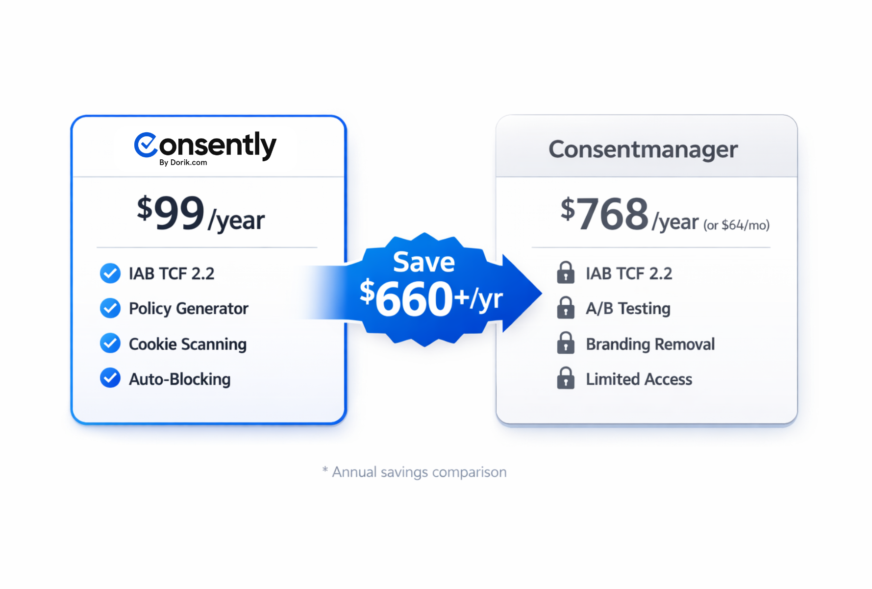For equivalent features, Consently costs significantly less. Consently Basic ($8.25/month) includes IAB TCF 2.2 and policy generation. ConsentManager requires Essential ($64/month) for IAB TCF access. Feature-equivalent annual cost: Consently $99 versus ConsentManager $768. Savings exceed $660 per year.