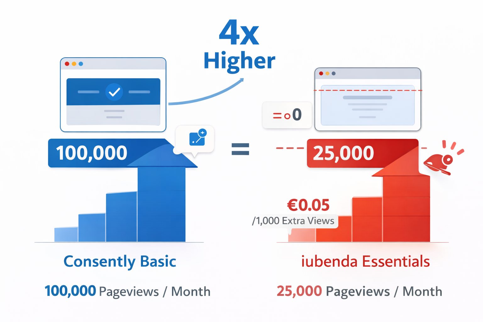 Consently offers significantly higher limits at every tier. Basic includes 100,000 monthly pageviews versus iubenda Essentials at 25,000. Premium jumps to 1,000,000 views compared to iubenda Advanced at 50,000. Enterprise handles 3,000,000 monthly pageviews versus iubenda Ultimate at 150,000. Both platforms allow purchasing additional capacity when needed*.