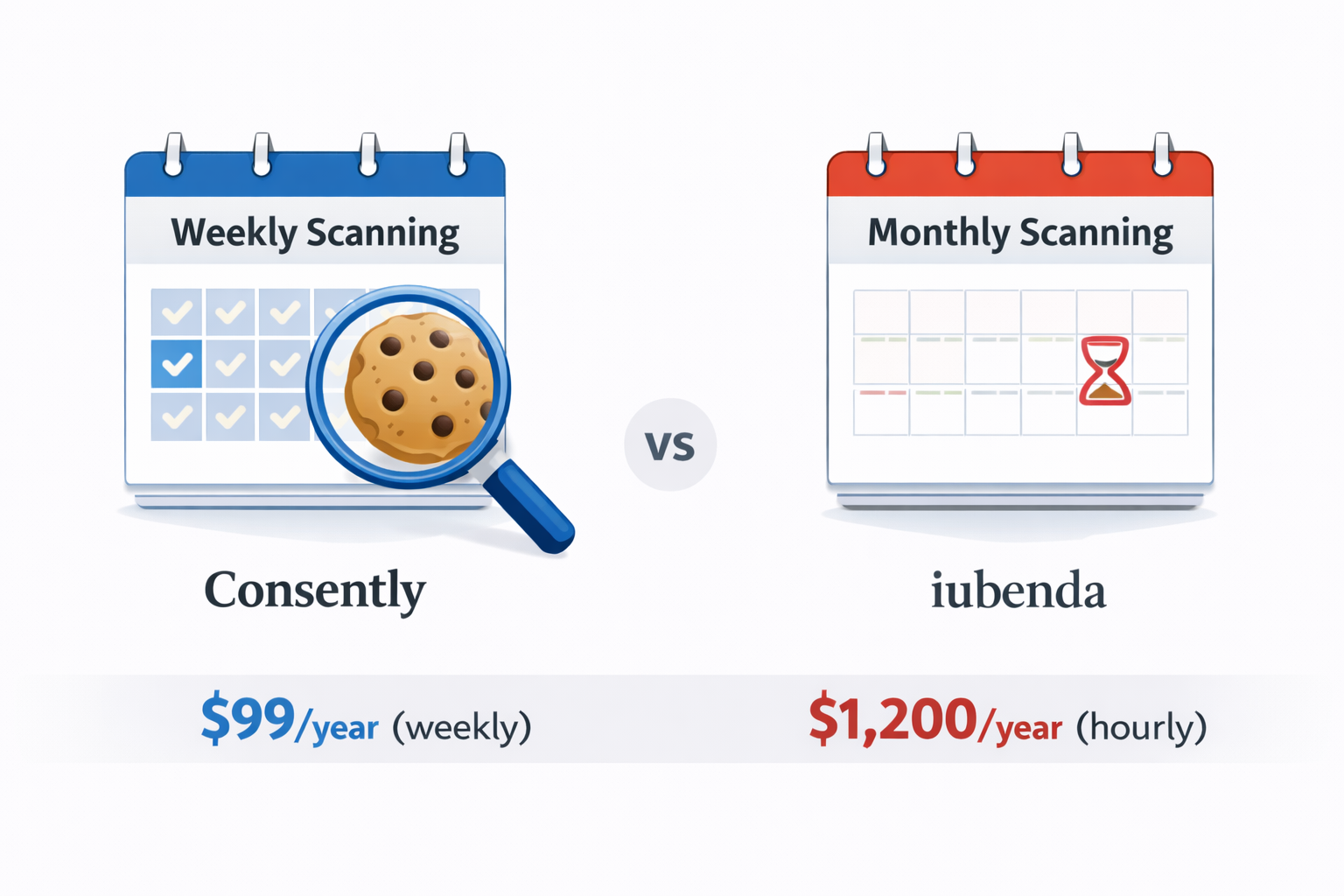 iubenda scans monthly on Essentials and Advanced tiers. Hourly scanning requires their Ultimate plan at $1,200/year. Consently runs weekly automated scans on all plans with unlimited on-demand scanning. Where iubenda makes you wait weeks to catch new cookies, Consently keeps your compliance current. Configure scanning with no page limits.