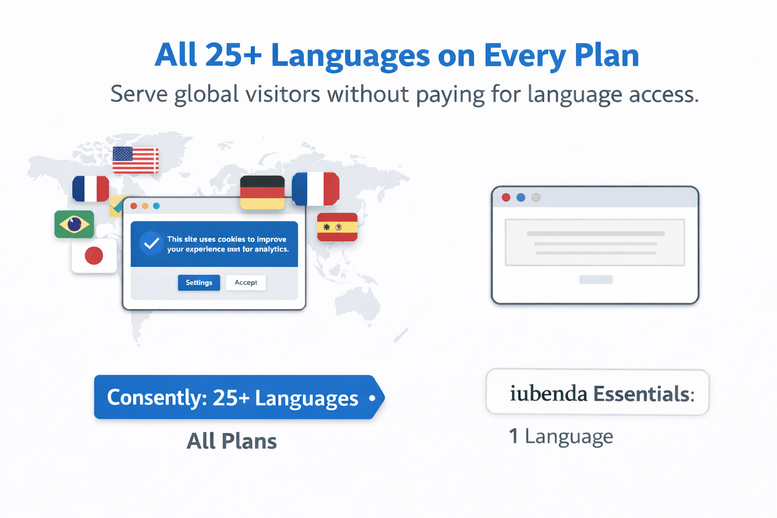 iubenda Essentials restricts banners to a single language. Reaching French, German, or Spanish visitors requires upgrading to their $299/year Advanced tier. Consently includes all 25+ supported languages on every plan starting at $99/year. Add languages with automatic detection via your site's HTML lang attribute.