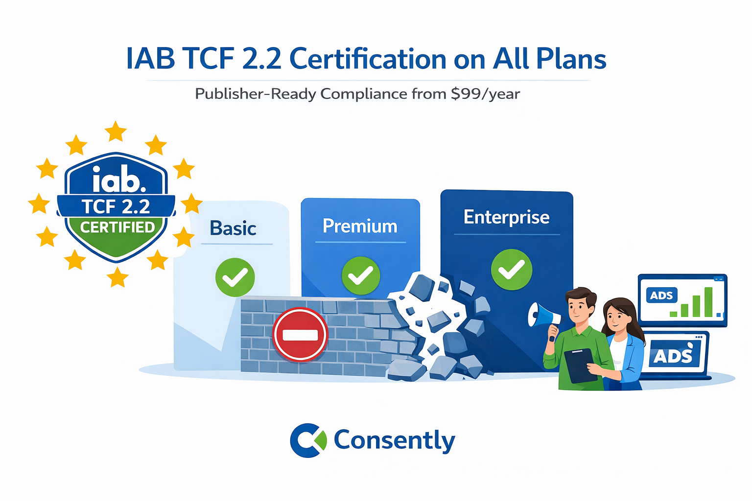 Usercentrics reserves IAB TCF 2.2 support for Pro tier and above, adding significant cost for publishers. Consently includes full TCF certification on Basic, Premium, and Enterprise plans. Both platforms communicate consent signals to advertising partners, but Consently removes the paywall between publishers and industry-standard compliance. Configure IAB TCF settings without upgrading.