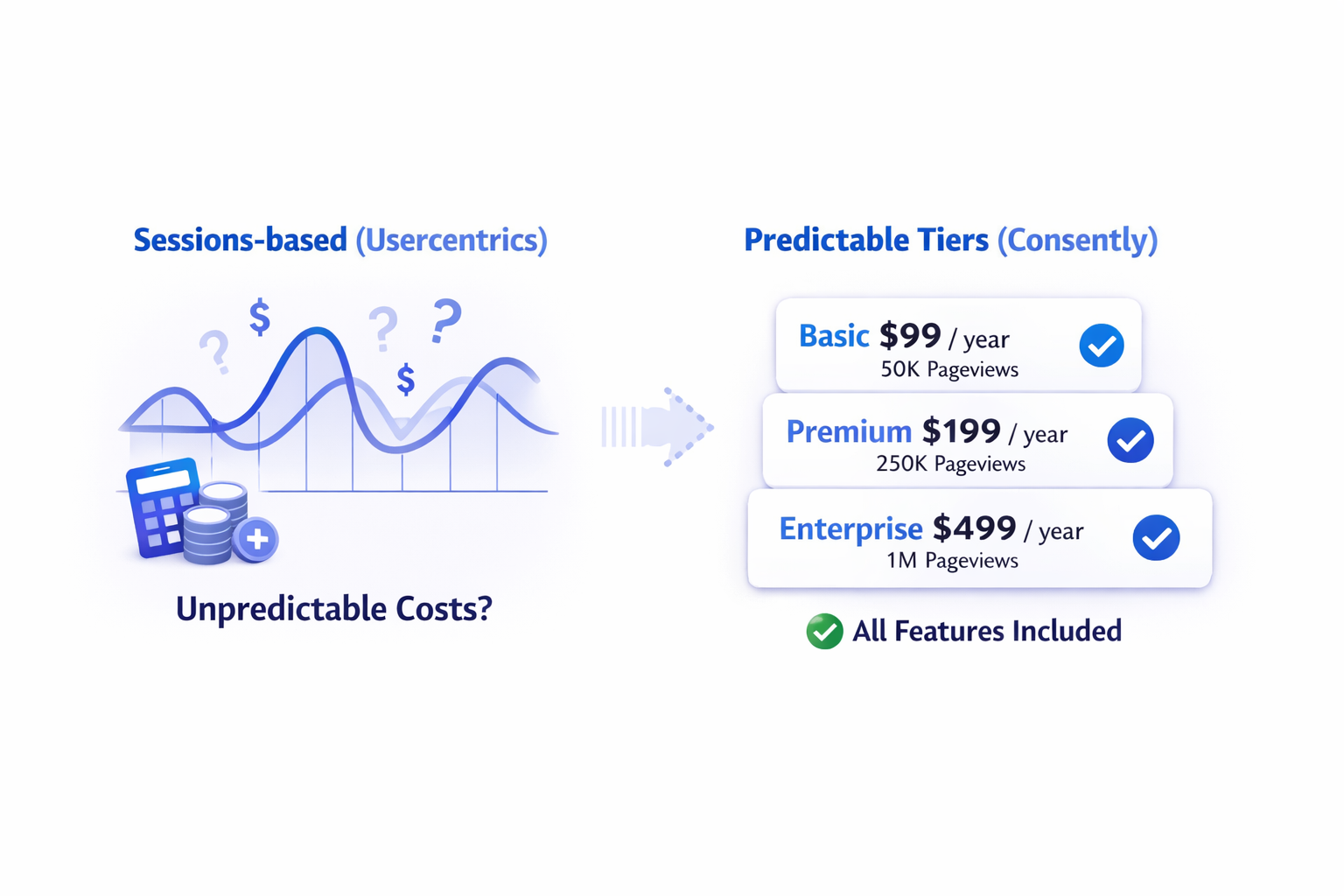 Usercentrics bills by sessions, creating cost uncertainty as traffic fluctuates. Consently offers three transparent tiers: Basic ($99/year, 50K pageviews), Premium ($199/year, 250K pageviews), and Enterprise ($499/year, 1M pageviews). Where Usercentrics spreads features across five web CMP plans, Consently includes everything on every tier. Budget compliance costs accurately without session-based surprises.
