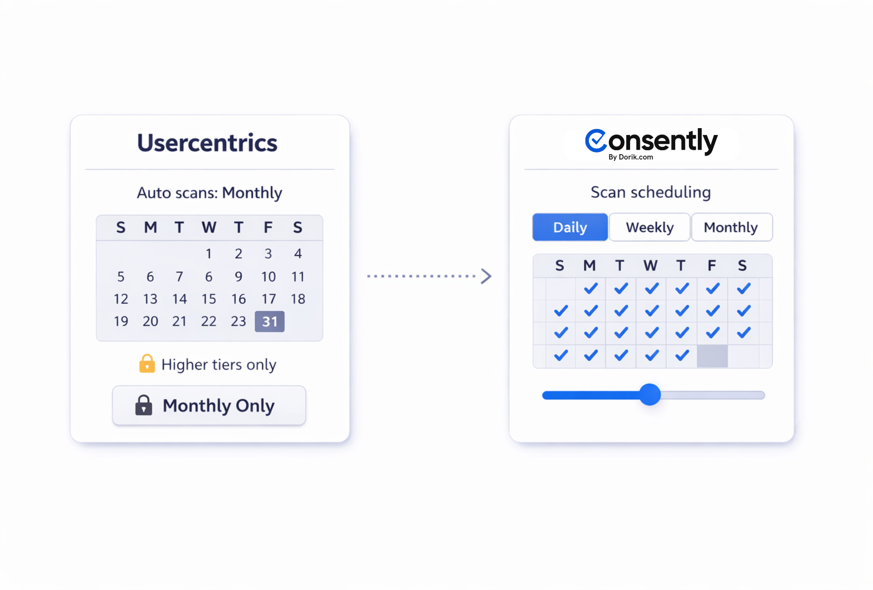 Usercentrics runs monthly scans on higher-tier plans, leaving weeks between tracker detection. Consently offers instant scanning whenever needed plus customizable automatic schedules: daily, weekly, or monthly. Where Usercentrics locks you into fixed scan cycles, Consently lets you choose the frequency that matches your site's update pace. Configure cookie auto-blocking with scans that fit your workflow.